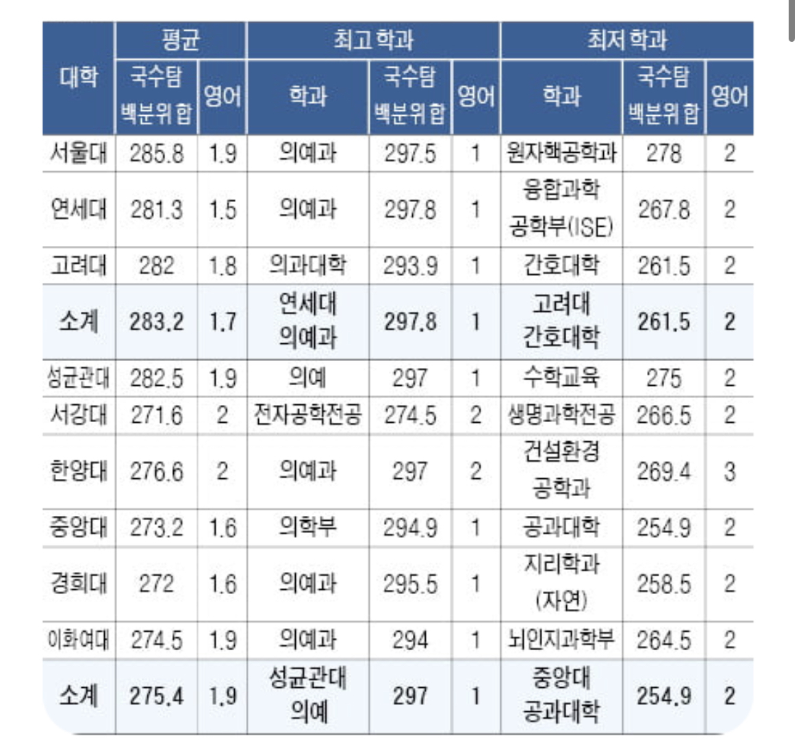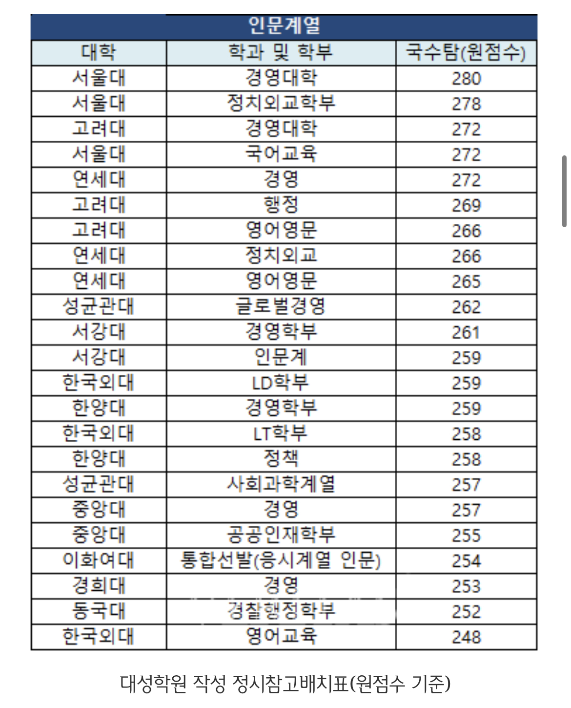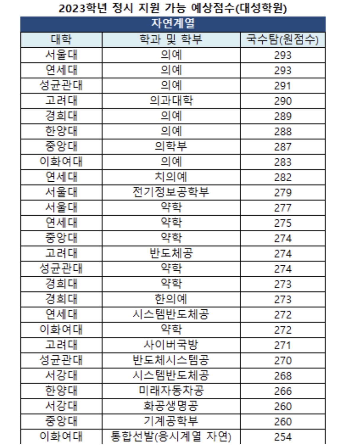 대성 학원 자료를 보면 자연계열에서는 의예과의 예상 합격선이 가장 높으며 인문계열에서는 경영 관련 모집단위의 점수대가 높을 것으로 예상됩니다.